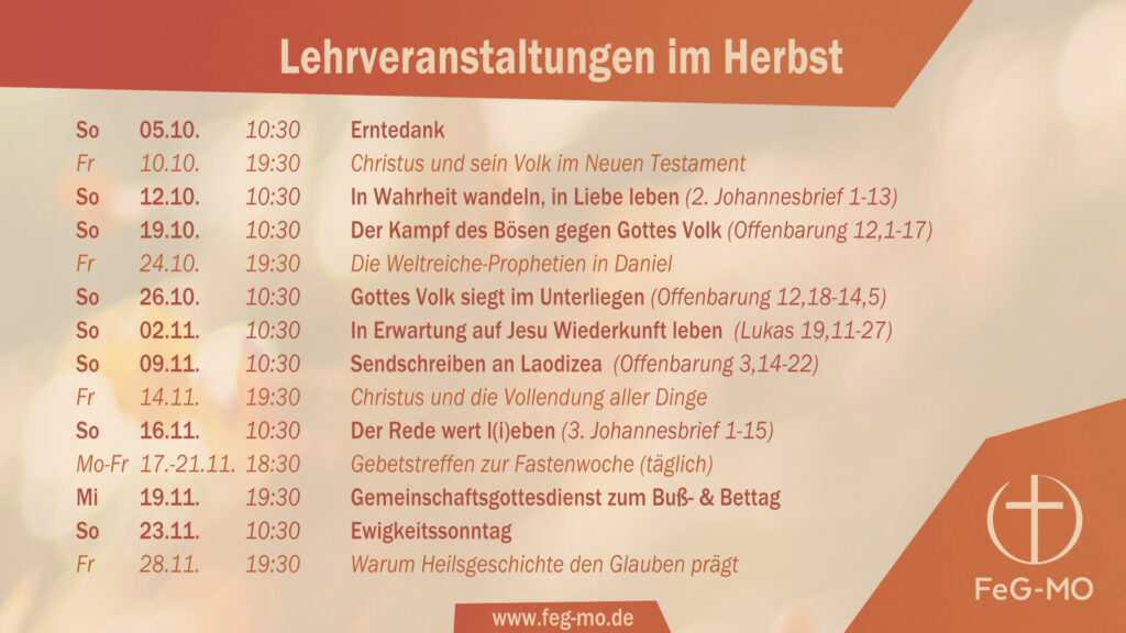 🍂 Wie das Herbstlaub: bunt, vielfältig und ein bisschen durcheinandergewürfelt – so ist unser Programm in den kommenden Wochen. Im neuen Flyer findest du alle Gottesdienste, Lehrabende und Veranstaltungen bis zum Advent. Schau rein, lass dich inspirieren und sei dabei!
